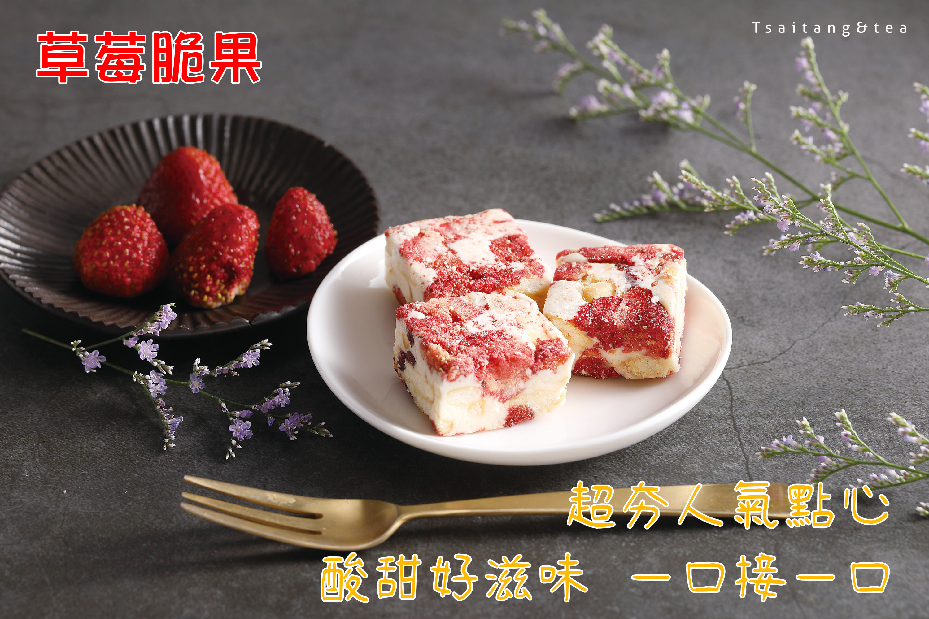 草莓脆果 將鮮凍草莓脆果混搭牛軋糖及餅乾,產生層次豐富且口感酸甜香脆,完整保留草莓的營養價值。 類別:蛋奶素 成份:麵粉、麥芽、海澡糖、奶油、奶粉、蛋白、鹽、乳糖、草莓凍乾、蔓越莓、草莓香料 規格:每包 250 公克(夾鍊立袋) 產地:台灣 保存方式:常溫(25℃以下)陰涼通風處陰涼通風處 保存期限:90天(請密封保存) (有效日期只適用於未拆封的商品,拆封後請立即食用) 包裝方式如下: